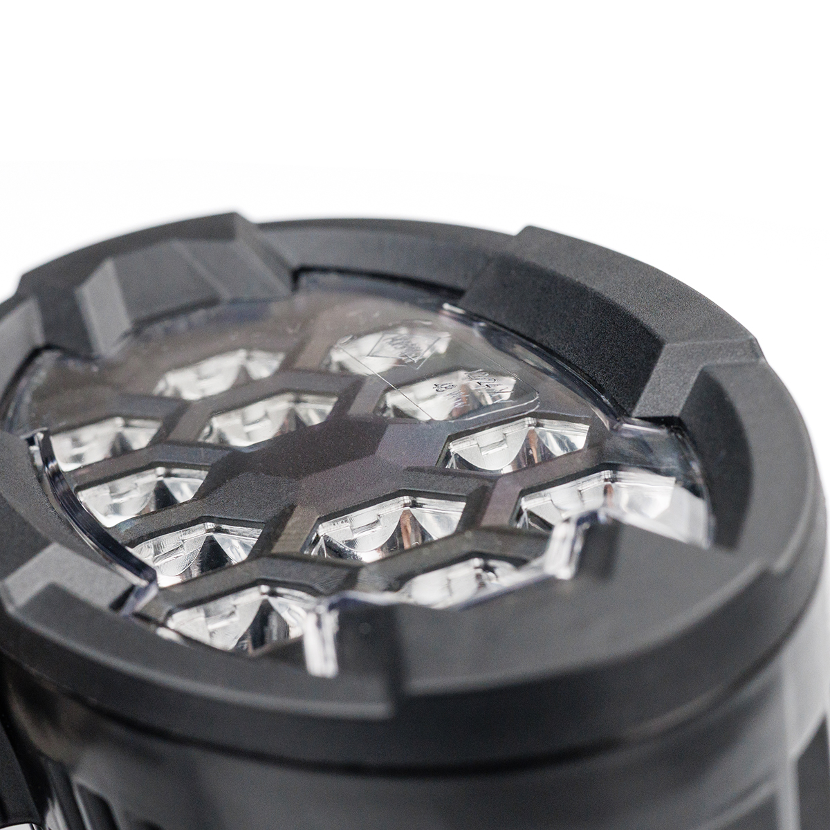 La robusta carcasa de la luz se ocupa de protegerla de daños mecánicos y el disipador de aluminio en la parte trasera garantiza una disipación eficaz del calor. La pantalla de policarbonato de alta calidad garantiza la resistencia al impacto, mientras que la membrana de compensación de presión evita la condensación y minimiza el riesgo de empañamiento.