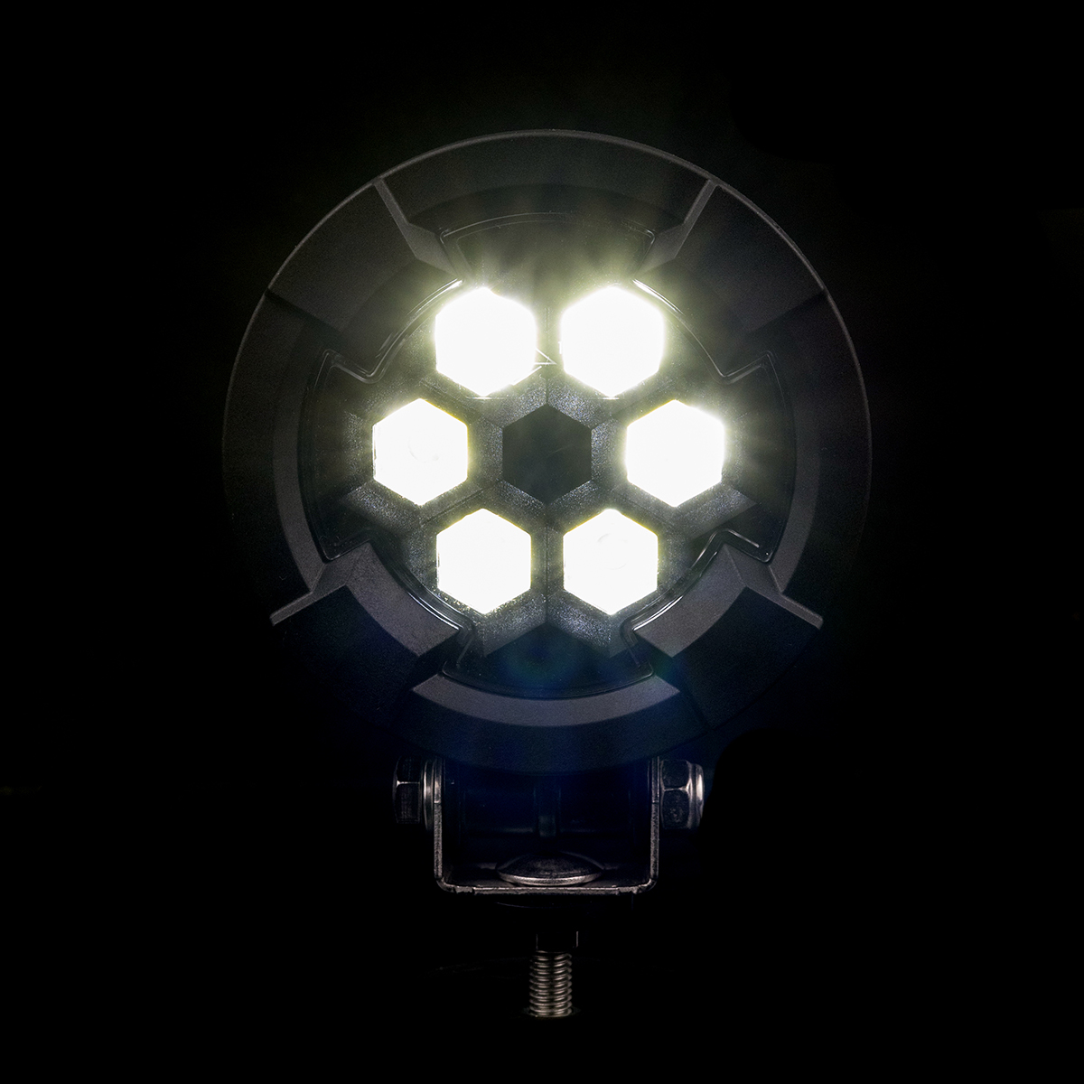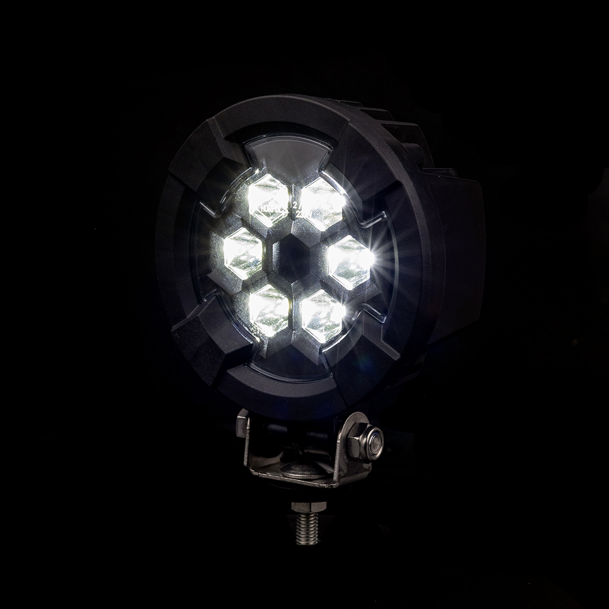 El robusto diseño redondo con una rejilla negra dirige la luz hacia el punto deseado limitando el efecto de deslumbramiento. La luz se puede instalar a ambos lados del vehículo y funciona tanto con instalaciones de 12 V como de 24 V, por lo que constituye una solución versátil apta para el uso con distintos tipos de vehículos y maquinaria. El soporte ajustable permite un ajuste fácil del ángulo de iluminación para poder adaptarlo con precisión a la tarea a ejecutar.