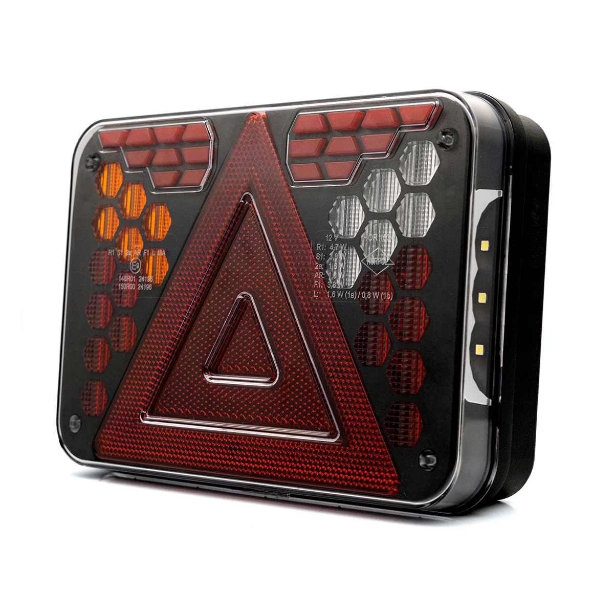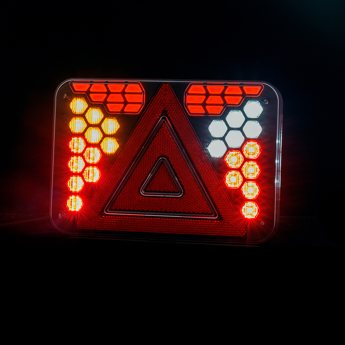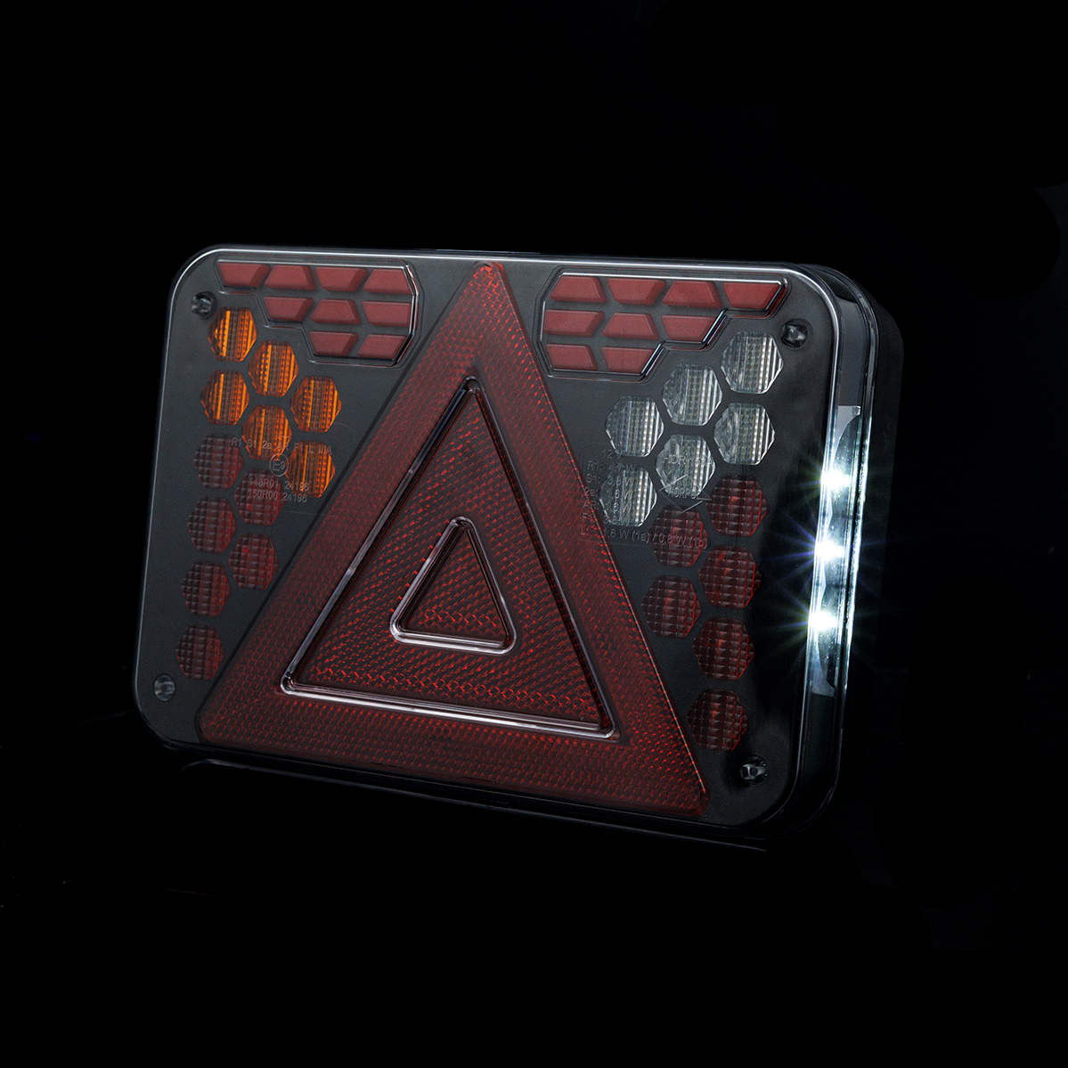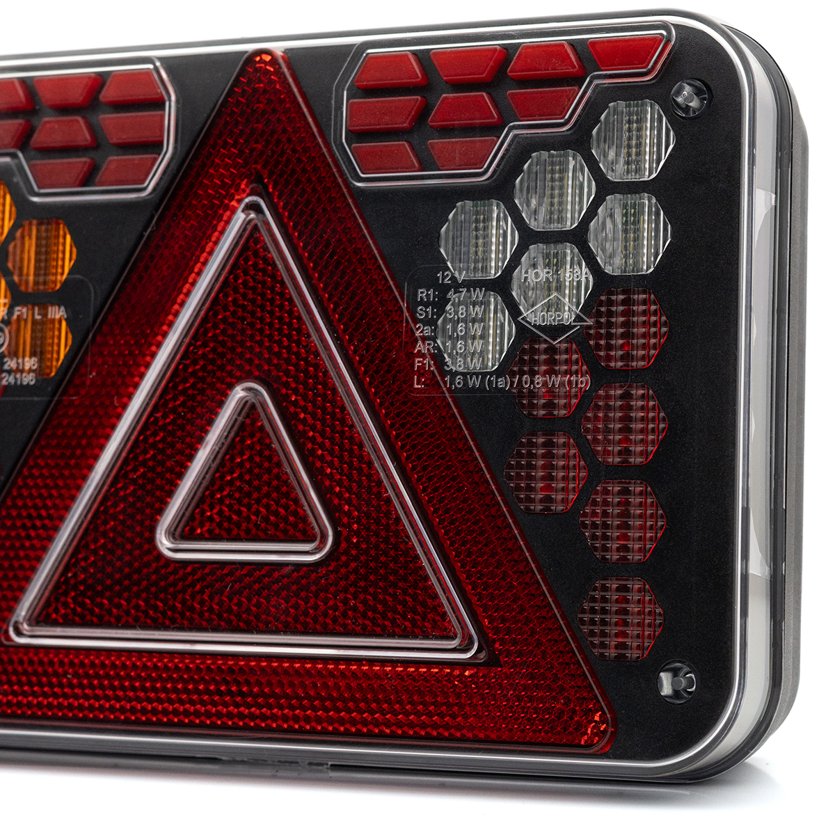 HORUS LZD 3215 es una luz combinada trasera de última generación indicada para el uso en remolques de coches, remolques agrícolas y remolques especializados, diseñada en un tamaño compacto pensando en la máxima durabilidad. El diseño de la lámpara se basa en módulos geométricos individuales con formas precisas que crean una composición luminosa coherente y llamativa contra el negro profundo de la carcasa. El conjunto está protegido mediante una pantalla de policarbonato transparente y duradera, resistente a los daños mecánicos para permitir el funcionamiento en condiciones exigentes.