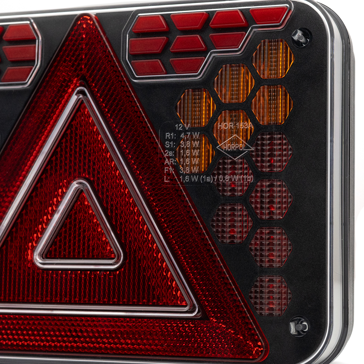 HORUS LZD 3216 es una luz combinada trasera de última generación indicada para el uso en remolques de coches, remolques agrícolas y remolques especializados, diseñada en un tamaño compacto pensando en la máxima durabilidad. El diseño de la lámpara se basa en módulos geométricos individuales con formas precisas que crean una composición luminosa coherente y llamativa contra el negro profundo de la carcasa. El conjunto está protegido mediante una pantalla de policarbonato transparente y duradera, resistente a los daños mecánicos para permitir el funcionamiento en condiciones exigentes.
