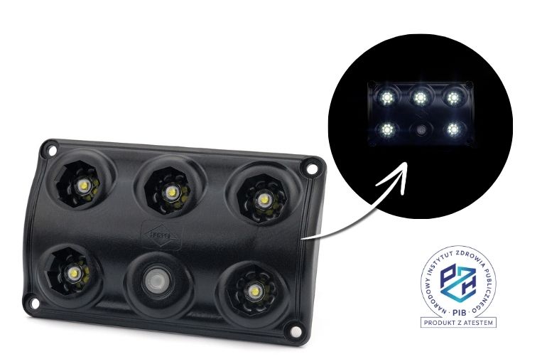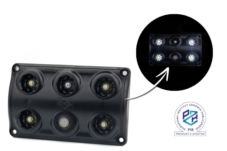 Se garantiza el funcionamiento de la luz sin interferencias con otros dispositivos eléctricos o electrónicos del vehículo, lo cual está confirmado mediante la homologación de compatibilidad electromagnética (EMC). La luz también cuenta con un certificado de higiene emitido por el Instituto Nacional de Higiene polaco, que acredita la seguridad de su uso en entornos con mayores exigencias sanitarias.