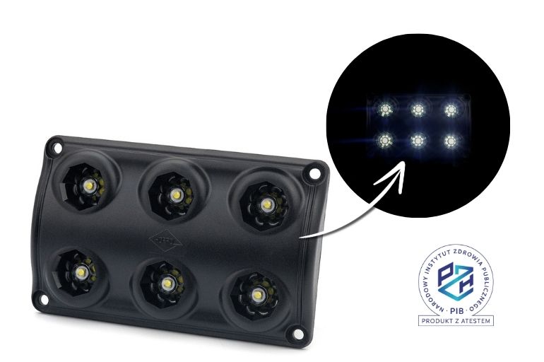 La luz cuenta con 6 LED que emiten luz blanca con una temperatura de color de 5000 K, garantizando una muy buena visibilidad y comodidad de trabajo en interiores de vehículos o vehículos taller. Un flujo luminoso de 990 lm garantiza una iluminación eficaz y uniforme del espacio. La luz funciona en instalaciones de 12 V y 24 V, convirtiéndose en una solución versátil apta para muchos tipos de vehículos.