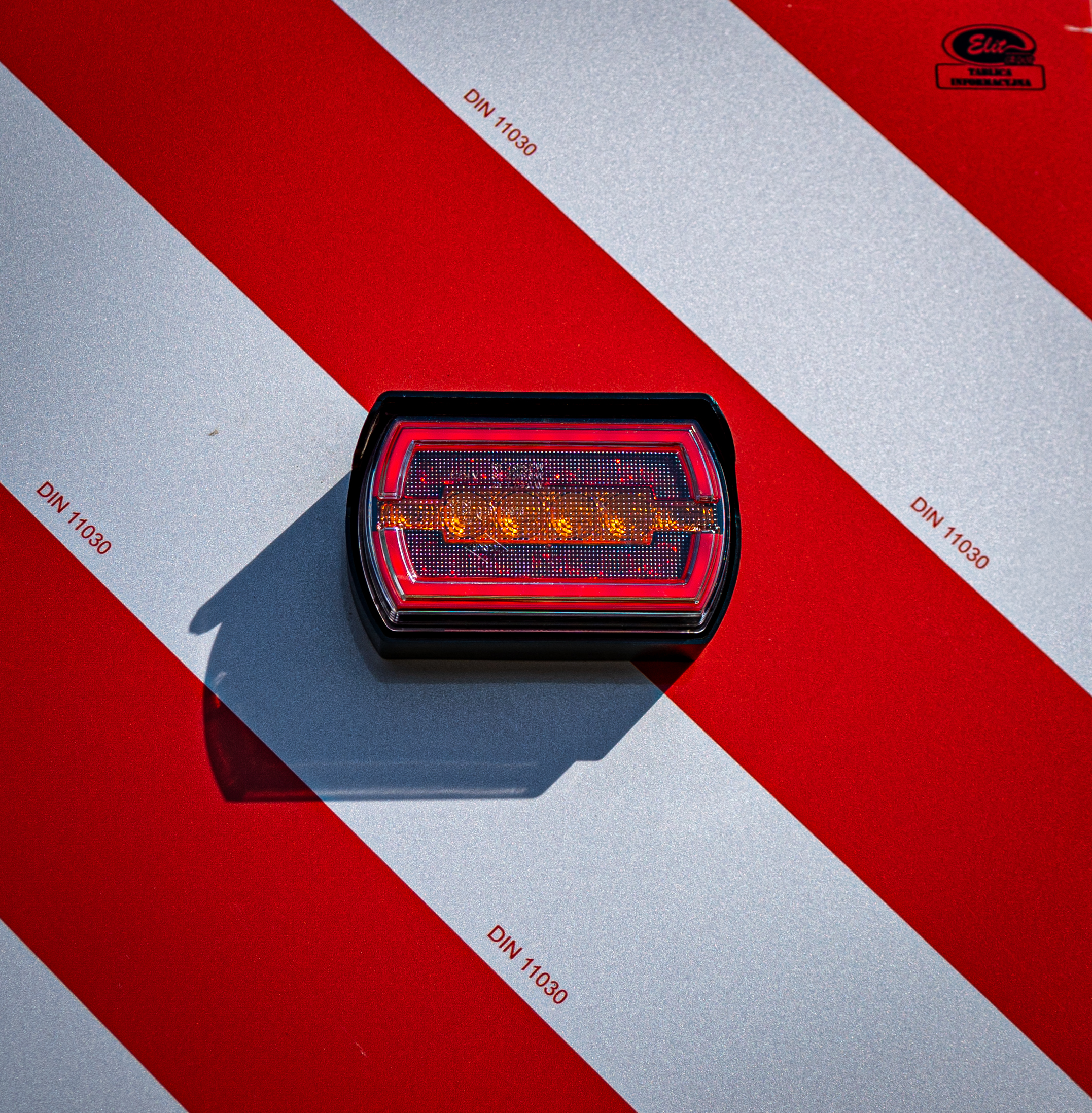 – dos paneles cuadrados para cargas sobredimensionadas (izquierdo y derecho), en disposición diagonal rojo-blanca, recubiertos con lámina reflectante por ambas caras (dimensiones de cada uno: 423 × 423 mm);