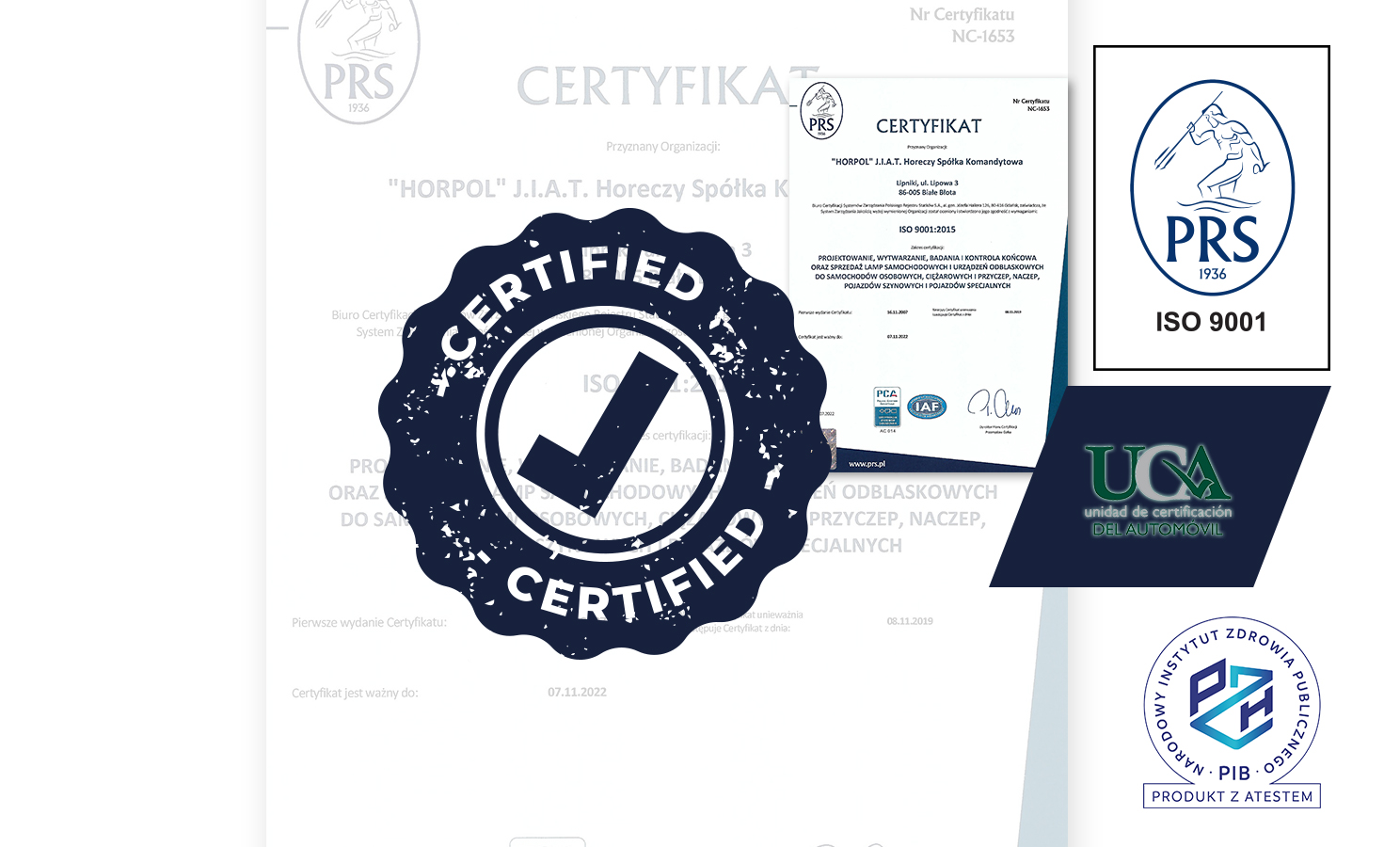 Horpol A. Horeczy Sp. k. es una empresa profesional especializada en la producción, inspección y venta de lámparas para automóviles y dispositivos reflectantes para todo tipo de vehículos de motor. En nuestras operaciones cotidianas, utilizamos un moderno sistema de gestión de la calidad conforme a la norma ISO 9001:2015, esforzándonos al máximo por mejorarlo continuamente. Como resultado, suministramos al mercado productos de alta calidad que cumplen las expectativas de los consumidores y la normativa legal.